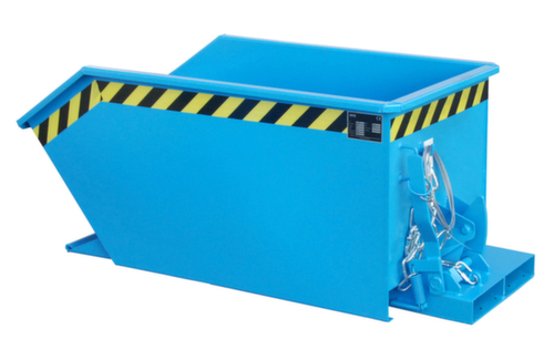 Les principales dimensions de la Bauer benne basculante en un coup d'œilLe procédé de basculement est déclenché confortablement depuis le siège conducteur par déverrouillage du câble de traction. La disposition particulière du pivot assure un angle de basculement avantageux et donc un vidage rapide et complet. Le retour à la position d’origine s’effectue par abaissement au sol et la protection antibasculement se réenclenche automatiquement. Avec une chaîne de sécurité sur les fourreaux de fourche, la benne basculante peut également être fixée au gerbeur afin d’éviter qu’elle ne glisse . Grande stabilité grâce à des bords renforcés sur tout le pourtour et à un châssis stable. Structure robuste en acier avec laquage coloris RAL 5012 bleu clair. Pour transporter et vider la benne basculante facilement, il suffit de la saisir avec le gerbeur via les fourreaux de fourche, puis de la placer à la position et à la hauteur souhaitées.