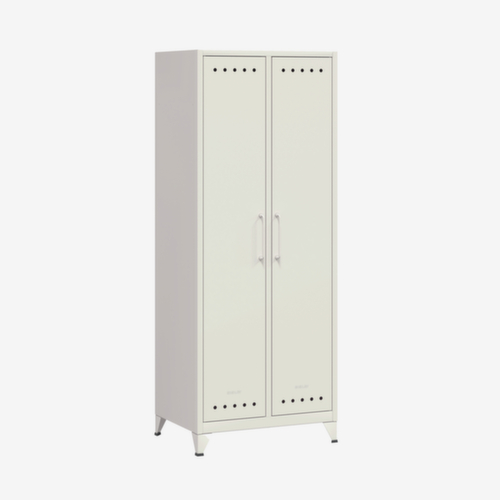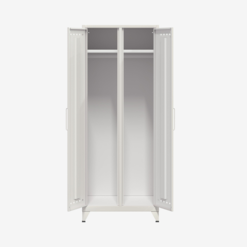 Les principales dimensions de la Bisley armoire à linge Fern Maxi en un coup d’œil :par compartiment Tablette à chapeaux et tringle. Avec cloison de séparation médiane. Fermeture avec protection contre la poussière via une porte à double battant. fermeture affleurante de la porte au corps. Avec poignées. Les orifices de ventilation design intégrés dans la porte assurent une circulation de l'air en continu. 4 pieds garantissent un support stable. structure en acier, soudé. corps avec laquage en blanc signalisation, face avant avec laquage en blanc signalisation.
