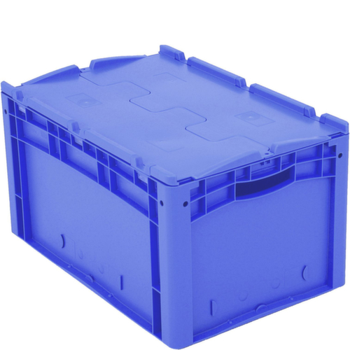 dimensions adaptées aux palettes européennes. en polypropylène incassable en bleu. Parois plein, fond double renfort. La marchandise stockée est protégée contre la poussière et la saleté grâce au couvercle à charnière en 2 parties. transport facile grâce à poignées. Plusieurs niveaux gerbable. convient pour aliments.