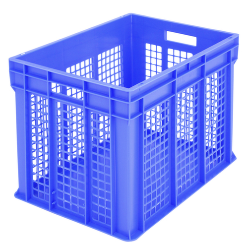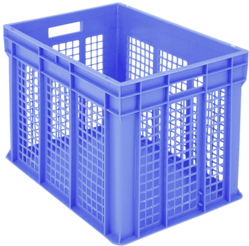 dimensions adaptées aux palettes européennes. en polypropylène incassable en bleu. Parois ajourés, fond plein. Fond avec renfort grâce à des rainures de renfort. transport facile grâce à poignées. facilement empilable avec rebord gerbable gerbable Plusieurs niveaux en toute sécurité. convient pour aliments. Adapté aux convoyeurs à rouleaux. Convient pour différents tissus, nous consulter.