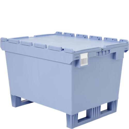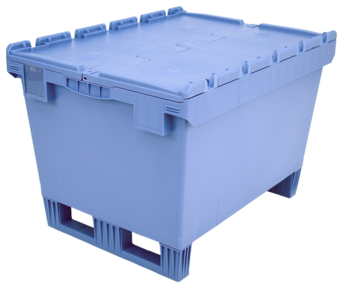 Norme européenne. en polypropylène incassable en bleu pigeon. La marchandise se stocke à l’abri de la poussière grâce aux parois fermées et le récipient se nettoie facilement. tablettes plein avec renfort grâce à rainures de renfort. couvercle crocodile. Les patins garantissent un déplacement et une prise facilités avec un gerbeur. empilable pour gain de place. Adapté aux convoyeurs à rouleaux.