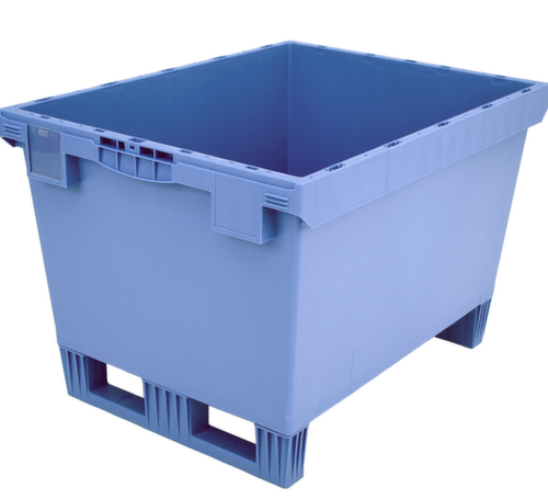 Norme européenne. en polypropylène incassable en bleu pigeon. La marchandise se stocke à l’abri de la poussière grâce aux parois fermées et le récipient se nettoie facilement. tablettes plein avec renfort grâce à rainures de renfort. Les patins garantissent un déplacement et une prise facilités avec un gerbeur. empilable pour gain de place. Adapté aux convoyeurs à rouleaux.