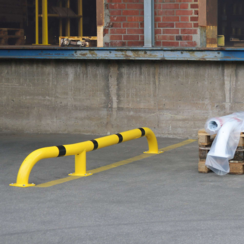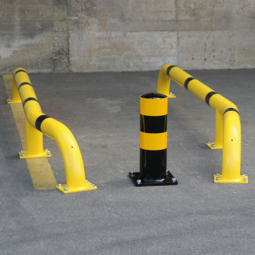principales dimensions du BLACK BULL système de protection anticollision en un coup d'œil :structure Les bandes réfléchissantes colorées assurent une bonne visibilité. en tube d'acier galvanisé à chaud avec revêtement plastique coloris jaune/noir. à cheviller dans la plaque de fond.