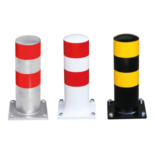 "longDescription": "<h2>Poteau de protection</h2><strong>idéal pour les accès aux rampes de chargement comme aide au stationnement de camions</strong><br><ul><li><strong>Bonne visibilité</strong> grâce aux anneaux réfléchissants colorés</li><li><strong>Extrêmement robuste</strong> - en acier galvanisé à chaud</li><li><strong>Utilisation fixe</strong> - avec plaque de fond à cheviller</li></ul><br><h3>Le choix vous appartient :</h3><ul><li><strong>Surface inusable</strong> - au choix avec revêtement plastique supplémentaire</li></ul>",