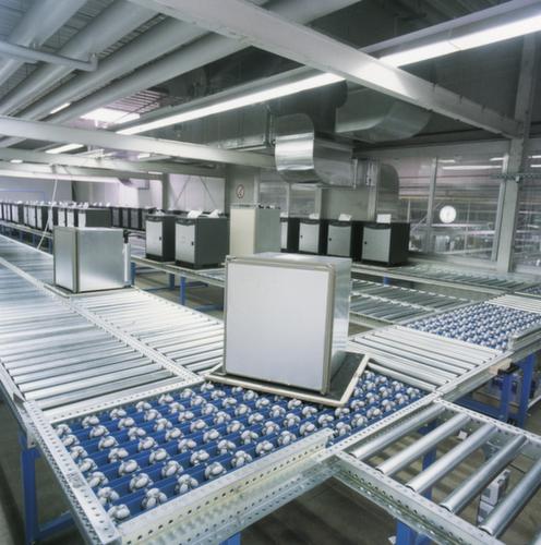 "longDescription": "<h2>Élément pour transporteur lourd à rouleaux</h2><strong>Courbe 45°</strong><br><ul><li>L'alternative économique dans le secteur des charges mi-lourdes</li><li>Solution idéale pour les cas où les convoyeurs à rouleaux légers ne suffisent plus et où les conditions de manutention exigent une construction robuste</li><li>Rouleaux en acier pour le transport par gravitation de marchandises à l'unité</li><li>L'inclinaison nécessaire de 2 à 5 % (suivant le type et le poids du produit transporté) s'ajuste grâce aux pieds support réglables en hauteur</li><li>Les transporteurs permettent aussi le transport de contenants surdimmensionnés et des poussées transversales</li><li>Montage facile et rapide, modulaire et évolutif</li></ul><br><h3>Cadre :</h3><ul><li>En profilés d'acier galvanisés en forme de U 40/80/40 x 3 mm</li><li>Avec lisses transversales vissées</li><li>Hauteur du cadre 70 mm</li><li>Hauteur de construction totale 80 mm- Élément courbé avec un rayon intérieur de 1000 mm</li></ul><br><h3>Axes et rouleaux :</h3><ul><li>Axe à ressort Ø 10 mm</li><li>Avec rouleaux de manutention en tube d'acier galvanisé Ø 50 x 1,5 mm avec roulements à billes lubrifiés en continu</li></ul><br><h3>À noter :</h3><ul><li>Le produit transporté doit disposer d'un fond indéformable qui peut être équipé de semelles longitudinales ou d'un rebord inférieur sur tout le pourtour</li><li>Le produit transporté doit reposer sur 3 axes de galets au moins pour une course efficace</li><li>Il doit ainsi présenter une longueur et un diamètre minimum de 75 mm</li></ul><br><h3>Accessoires (à commander séparément) :</h3><ul><li>Butée d'arrêt</li><li>Guidage latéral (exigé à partir de 2 m de hauteur de convoyage)</li><li>Bipied de montage fixe</li><li>Bipieds extra-lourds</li></ul><br>Aide à la planification :<br>Largeur du produit transporté - largeur du convoyeur<br><ul><li>La plus grande largeur du produit transporté détermine la largeur du convoyeur</li><li>Le modèle permet une course efficace même en cas de dépassement latéral minime du produit transporté de 100 mm de chaque côté</li><li>Veillez à ce que la largeur du convoyeur ne soit pas inférieure à la largeur du produit transporté</li><li>La largeur minimum du produit transporté est de 200 mm</li></ul>Longueur du produit transporté - empattement<br><ul><li>La longueur mini du produit transporté détermine l'empattement</li><li>Le produit transporté doit à tout moment reposer sur 3 axes de galets au minimum</li><li>Longueur mini du produit transporté : 3 = empattement requis</li><li>Longueur maxi du produit transporté dans les virages 1000 mm, au choix sur les éléments droits</li></ul>Poids du produit transporté - écartement des pieds<br><ul><li>Le poids du produit transporté détermine l'écartement des pieds support et donc leur nombre</li><li>L'écartement des pieds ne doit pas dépasser 2 m</li><li>Force statique maxi de 300 kg par mètre de longueur du convoyeur et pour un mètre d'écartement des pieds</li></ul>",