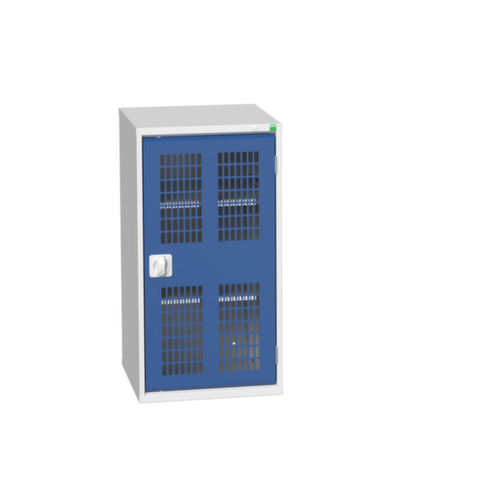 Le corps de l’armoire est fabriqué en acier et soudé de manière stable. Cela rend la structure particulièrement robuste et résistante, et donc plus durable. Les coins et les angles soudés du corps garantissent une plus grande étanchéité et donc une meilleure protection contre la poussière, l’humidité et la saleté qu’une structure vissée. En outre, il n’est pas nécessaire de procéder à des travaux d’entretien réguliers ni à des réajustements. porte battante avec fentes d'aération. verrouillable avec serrure à penne rotatif. Le socle encastré permet de répartir uniformément le poids de l’armoire sur le sol. Cela augmente la stabilité et l’armoire peut supporter des charges plus lourdes qu’une armoire à pieds. De plus, la saleté, la poussière et l’humidité ne peuvent pas s’infiltrer sous l’armoire, ce qui réduit la surface de nettoyage.