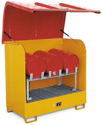 "longDescription": "<h2>Dépôt de matières dangereuses en acier</h2><ul><li>Boîtier et bac de récupération en tôle d'acier de 3 mm d'épaisseur, galvanisé à chaud ou peint en jaune-orange RAL 2000</li><li>Capot en plastique renforcé de fibre de verre (GFK) avec serrure cylindrique</li><li>2 ressorts à pression de gaz soutiennent l'ouverture et la fermeture de la capote</li><li>Transport à vide en toute sécurité grâce aux poches des chariots élévateurs à fourche</li></ul>",