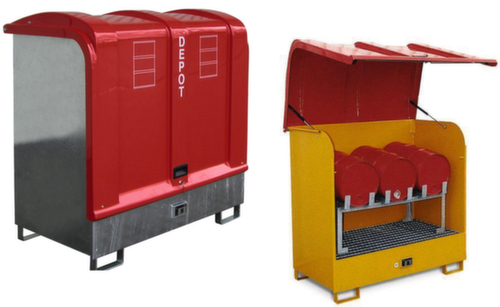 "longDescription": "<h2>Dépôt de matières dangereuses en acier</h2><ul><li>Boîtier et bac de récupération en tôle d'acier de 3 mm d'épaisseur, galvanisé à chaud ou peint en jaune-orange RAL 2000</li><li>Capot en plastique renforcé de fibre de verre (GFK) avec serrure cylindrique</li><li>2 ressorts à pression de gaz soutiennent l'ouverture et la fermeture de la capote</li><li>Transport à vide en toute sécurité grâce aux poches des chariots élévateurs à fourche</li></ul>",