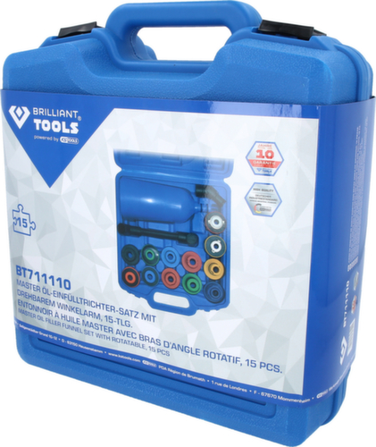 "longDescription": "<ul><li class=\"liste\">convient idéalement pour un remplissage propre, professionnel et écologique</li><li class=\"liste\">entonnoir spécial avec joint d'étanchéité</li><li class=\"liste\">connexion directe et étanche avec l'orifice de remplissage d'huile</li><li class=\"liste\">plus de remplissage long et fastidieux</li><li class=\"liste\">évite les pertes et les salissures dues aux fuites d'huile sur le bloc moteur ou le collecteur d'échappement</li><li class=\"liste\">avec bras angulaire rotatif pour les endroits difficiles d'accès</li><li class=\"liste\">différents adaptateurs inclus</li><li class=\"liste\">montage sans jeu sur le moteur</li><li class=\"liste\">version système enfichable</li><li class=\"liste\">matière plastique spéciale</li></ul><br />Le kit d'adaptateurs de remplissage d'huile BT711110 de BRILLIANT TOOLS permet, grâce à la capacité de 2 litres de l'entonnoir, de remplir rapidement le moteur sans renverser d'huile. Grâce aux adaptateurs à code couleur, ce kit convient à de nombreux modèles de véhicules. Grâce à la rallonge pivotante et coudée, le système peut également être utilisé dans des endroits difficiles d'accès.<br /><br /><strong>Contenu de la livraison :</strong><br /><br />1 - Entonnoir 2 l<br />2 - Bras coudé pivotant<br />3 - Coude<br />4 - Adaptateur à baïonnette pour <strong>Audi, BMW, Mercedes, Porsche, Škoda, Seat, Volvo, Volkswagen</strong><br />5 - Adaptateur à baïonnette pour <strong>Toyota, Lexus</strong><br />6 - Adaptateur M37x3,0 pour <strong>Lotus, Pontiac,Lexus, Toyota</strong><br />7 - Adaptateur M35x4,0 pour <strong>Ford, Jaguar, Land Rover, Mazda</strong><br />8 - M32x3,5 Adaptateur pour <strong>Dodge, Ford, Honda, Jaguar, Jeep, Land Rover, Mazda, Nissan</strong><br />9 - M42x4,5 Adaptateur pour <strong>Subaru</strong><br />10 - M30x3,0 Adaptateur pour <strong>Dodge</strong><br />11 - Adaptateur fileté à baïonnette pour <strong>Mazda, Volvo</strong><br />12 - Adaptateur fileté à baïonnette pour <strong>Cadillac, Chevrolet, Ford, Hyundai, Jaguar, Land Rover, Mazda, Saab</strong><br /><br />NOTRE QUALITÉ : BRILLANT<br />NOS PRIX : SMART<br /><br />Chaque outil renferme plus d'un quart de siècle d'expérience de nos experts. Cette qualité sans compromis, des outils professionnels de la plus haute qualité pour le dur travail quotidien, est l'une des recettes de notre succès. Nous renonçons à une grande structure de distribution et à des activités de marketing extravagantes et pouvons donc te proposer les produits à un rapport qualité-prix sensationnel. Economise de l'argent sans baisser tes exigences de qualité !<br /><br />Un outil de qualité powered by KS TOOLS.<br /><br>",