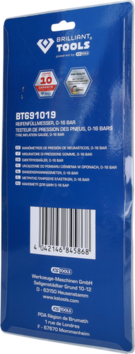 "longDescription": "<ul><li class=\"liste\">0 - 16 bar</li></ul><br />Le gonfleur de pneus BRILLIANT TOOLS BT691019 a une plage de mesure de 0 à 16 bar. Grâce à la valve de dégonflage latérale, il convient non seulement au gonflage mais aussi au dégonflage. Il permet ainsi de régler sans effort la pression correspondante. Le manomètre est équipé d'une échelle en bar et en psi et est parfaitement protégé contre les dommages par un revêtement en caoutchouc. Grâce à l'embout de raccordement 1/4\" inclus dans la livraison, le gonfleur de pneus est directement prêt à l'emploi.<br /><br />NOTRE QUALITÉ : BRILLANTE<br />NOTRE PRIX : SMART<br /><br />Chaque outil est le fruit de plus d'un quart de siècle d'expérience de nos experts. Cette qualité sans compromis, des outils professionnels de la plus haute qualité pour le dur travail quotidien, est l'une des recettes de notre succès. Nous renonçons à une grande structure de distribution et à des activités de marketing extravagantes et pouvons donc te proposer les produits à un rapport qualité-prix sensationnel. Economise de l'argent sans baisser tes exigences de qualité !<br /><br />Un outil de qualité powered by KS TOOLS.<br /><br>",