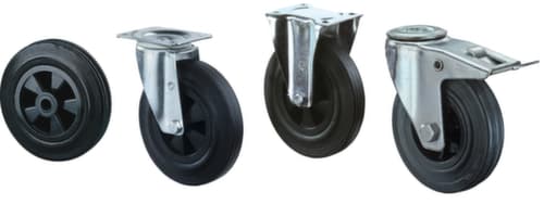 "description": "en différents modèles et diamètres de roue, avec ou sans frein, avec jante en plastique et palier lisse",