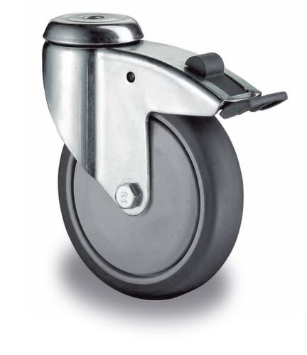 moyeu avec roulement à billes adapté pour un usage en continu. Double blocage pour le blocage simultané de la direction et de la roue. jante en plastique. jante avec pare-fils qui empêche un enchevêtrement et réduit la fréquence de maintenance de la roulette. boîtier en acier avec revêtement en zinc anti-corrosion. fixation avec trou de fixation, Ø 10,2 mm. Palier de pivotement avec roulement à billes.
