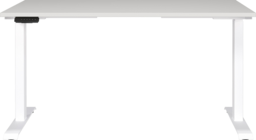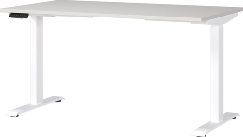 panneau en aggloméré avec revêtement mélaminé, facile d’entretien finition gris clair. forme de panneau angulaire. bord Une bande de chant ABS résistant aux chocs protège tous les bords de fissures et d'éclatements inesthétiques. piètement en C en métal avec finition époxy résistante aux chocs et aux rayures en blanc. réglage en hauteur via 2 moteurs électriques facilitent le réglage en hauteur par simple pression d'un bouton. fonctions : Mémorisation et rappel automatique des hauteurs de table programmées grâce à la fonction mémoire. La protection anti-collision automatique s'arrête immédiatement en cas de résistance du haut ou du bas et garantit ainsi une protection absolue. châssis avec patins en plastique. Avec câble d'alimentation, fiche et unité de commande électrifiable.