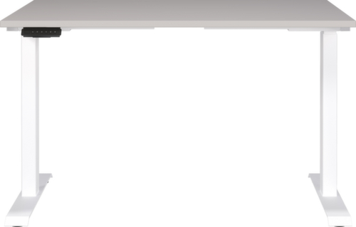 panneau en aggloméré avec revêtement en résine mélaminée antirayures et facile d'entretien finition finition en cachemire. forme de panneau angulaire. bord avec bande de chant ABS résistante aux chocs qui offre une protection contre les fissures et les éclatements disgracieux. double piètement en T en métal avec finition époxy résistante aux chocs et aux rayures en blanc. réglage en hauteur via moteur électrique. châssis avec patins en plastique de mise à niveau, parfaits pour compenser les inégalités du sol. Avec câble d'alimentation, fiche et unité de commande électrifiable.