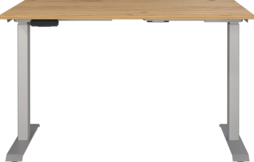 panneau en aggloméré avec revêtement en résine mélaminée antirayures et facile d'entretien finition chêne Navarra. forme de panneau angulaire. bord avec bande de chant ABS résistante aux chocs qui offre une protection contre les fissures et les éclatements disgracieux. double piètement en T en métal avec finition époxy résistante aux chocs et aux rayures en argent. réglage en hauteur via moteur électrique. fonctions : Mémorisation et rappel automatique des hauteurs de table programmées grâce à la fonction mémoire. châssis avec patins en plastique de mise à niveau, parfaits pour compenser les inégalités du sol. Avec câble d'alimentation, fiche et unité de commande électrifiable.