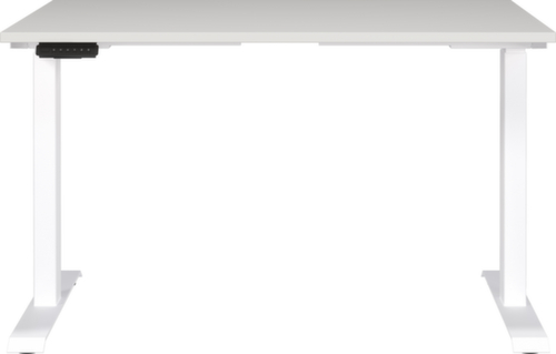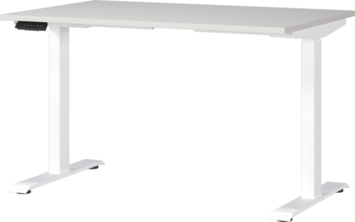 panneau en aggloméré avec revêtement en résine mélaminée antirayures et facile d'entretien finition gris clair. forme de panneau angulaire. bord avec bande de chant ABS résistante aux chocs qui offre une protection contre les fissures et les éclatements disgracieux. double piètement en T en métal avec finition époxy résistante aux chocs et aux rayures en blanc. réglage en hauteur via moteur électrique. fonctions : Mémorisation et rappel automatique des hauteurs de table programmées grâce à la fonction mémoire. châssis avec patins en plastique de mise à niveau, parfaits pour compenser les inégalités du sol. Avec câble d'alimentation, fiche et unité de commande électrifiable.
