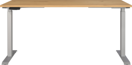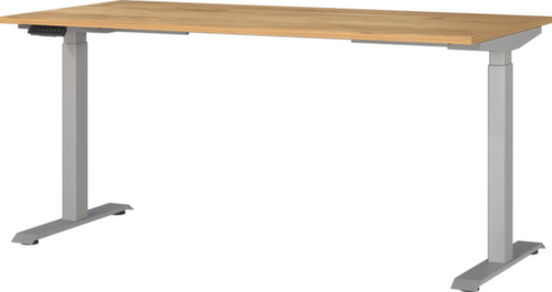 panneau en aggloméré avec revêtement en résine mélaminée antirayures et facile d'entretien finition chêne Navarra. bord avec bande de chant ABS résistante aux chocs qui offre une protection contre les fissures et les éclatements disgracieux. double piètement en T en métal avec finition époxy résistante aux chocs et aux rayures en argent. châssis avec patins en plastique de mise à niveau, parfaits pour compenser les inégalités du sol. Avec câble d'alimentation, fiche et unité de commande électrifiable.
