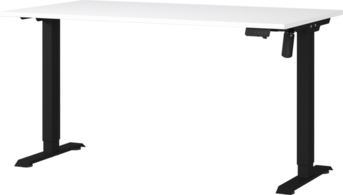 panneau en aggloméré avec revêtement mélaminé, facile d’entretien finition blanc. bord avec bande de chant ABS résistante aux chocs qui offre une protection contre les fissures et les éclatements disgracieux. piètement en T en métal avec finition époxy résistante aux chocs et aux rayures en noir. réglage en hauteur via moteur électrique. châssis avec patins en plastique de mise à niveau, parfaits pour compenser les inégalités du sol.