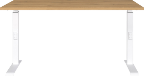panneau en aggloméré avec revêtement mélaminé, facile d’entretien finition chêne Grandson. forme de panneau angulaire. bord Une bande de chant ABS résistant aux chocs protège tous les bords de fissures et d'éclatements inesthétiques. piètement en C en métal avec finition époxy résistante aux chocs et aux rayures en blanc. réglage en hauteur via mécanisme. châssis avec patins en plastique.