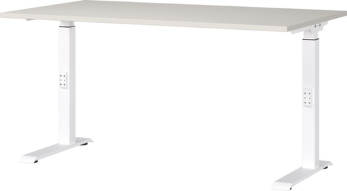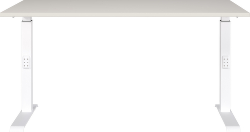 panneau en aggloméré avec revêtement mélaminé, facile d’entretien finition gris clair. forme de panneau angulaire. bord Une bande de chant ABS résistant aux chocs protège tous les bords de fissures et d'éclatements inesthétiques. piètement en C en métal avec finition époxy résistante aux chocs et aux rayures en blanc. réglage en hauteur via mécanisme. châssis avec patins en plastique.