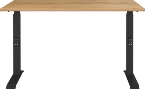 panneau en aggloméré avec revêtement mélaminé, facile d’entretien finition chêne Navarra. bord avec bande de chant ABS résistante aux chocs qui offre une protection contre les fissures et les éclatements disgracieux. piètement en C en métal avec finition époxy résistante aux chocs et aux rayures en noir. réglage en hauteur via mécanisme. châssis avec patins en plastique de mise à niveau, parfaits pour compenser les inégalités du sol.