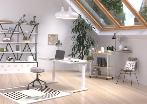 panneau en aggloméré avec revêtement mélaminé, facile d’entretien finition finition en cachemire. bord avec bande de chant ABS résistante aux chocs qui offre une protection contre les fissures et les éclatements disgracieux. piètement en C en métal avec finition époxy résistante aux chocs et aux rayures en blanc. réglage en hauteur via mécanisme. châssis avec patins en plastique de mise à niveau, parfaits pour compenser les inégalités du sol.