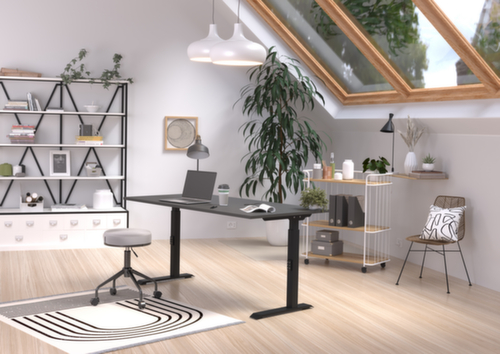 panneau en aggloméré avec revêtement en résine mélaminée antirayures et facile d'entretien finition graphite. bord Une bande de chant ABS résistant aux chocs protège tous les bords de fissures et d'éclatements inesthétiques. piètement en C en métal avec finition époxy résistante aux chocs et aux rayures en noir. réglage en hauteur via mécanisme. châssis avec patins en plastique de mise à niveau, parfaits pour compenser les inégalités du sol.
