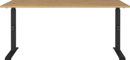 panneau en aggloméré avec revêtement en résine mélaminée antirayures et facile d'entretien finition chêne Grandson. bord Une bande de chant ABS résistant aux chocs protège tous les bords de fissures et d'éclatements inesthétiques. piètement en C en métal avec finition époxy résistante aux chocs et aux rayures en noir. réglage en hauteur via mécanisme. châssis avec patins en plastique de mise à niveau, parfaits pour compenser les inégalités du sol.