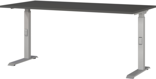 panneau en aggloméré avec revêtement en résine mélaminée antirayures et facile d'entretien finition graphite. bord Une bande de chant ABS résistant aux chocs protège tous les bords de fissures et d'éclatements inesthétiques. piètement en C en métal avec finition époxy résistante aux chocs et aux rayures en argent. réglage en hauteur via mécanisme. châssis avec patins en plastique de mise à niveau, parfaits pour compenser les inégalités du sol.
