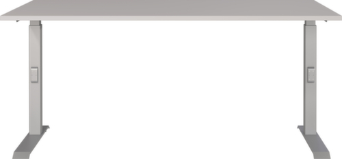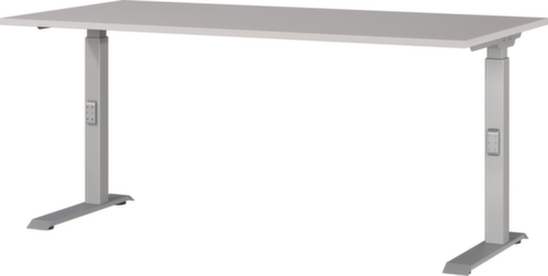 panneau en aggloméré avec revêtement en résine mélaminée antirayures et facile d'entretien finition finition en cachemire. bord Une bande de chant ABS résistant aux chocs protège tous les bords de fissures et d'éclatements inesthétiques. piètement en C en métal avec finition époxy résistante aux chocs et aux rayures en argent. réglage en hauteur via mécanisme. châssis avec patins en plastique de mise à niveau, parfaits pour compenser les inégalités du sol.