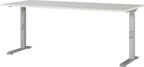 panneau en aggloméré avec revêtement en résine mélaminée antirayures et facile d'entretien finition gris clair. bord Une bande de chant ABS résistant aux chocs protège tous les bords de fissures et d'éclatements inesthétiques. piètement en C en métal avec finition époxy résistante aux chocs et aux rayures en argent. réglage en hauteur via mécanisme. châssis avec patins en plastique de mise à niveau, parfaits pour compenser les inégalités du sol.