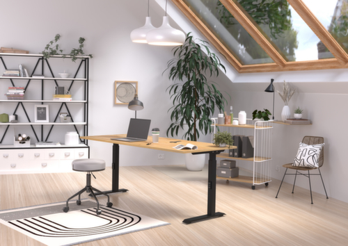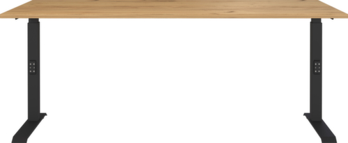 panneau en aggloméré avec revêtement en résine mélaminée antirayures et facile d'entretien finition chêne Navarra. bord Une bande de chant ABS résistant aux chocs protège tous les bords de fissures et d'éclatements inesthétiques. piètement en C en métal avec finition époxy résistante aux chocs et aux rayures en noir. réglage en hauteur via mécanisme. châssis avec patins en plastique de mise à niveau, parfaits pour compenser les inégalités du sol.