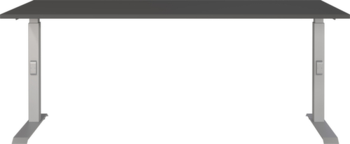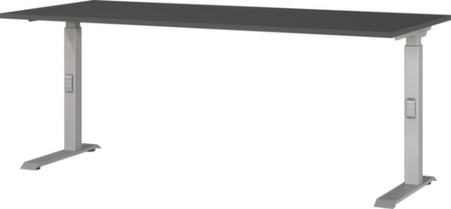 panneau en aggloméré avec revêtement en résine mélaminée antirayures et facile d'entretien finition graphite. bord Une bande de chant ABS résistant aux chocs protège tous les bords de fissures et d'éclatements inesthétiques. piètement en C en métal avec finition époxy résistante aux chocs et aux rayures en argent. réglage en hauteur via mécanisme. châssis avec patins en plastique de mise à niveau, parfaits pour compenser les inégalités du sol.