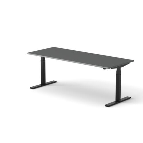 panneau en aggloméré avec revêtement mélaminé, facile d’entretien finition MS Slate. forme de panneau rectangulaire. piètement en T en RAL9005 noir foncé. réglage en hauteur via moteur électrique avec transmission manuelle. avec fiche Euro.
