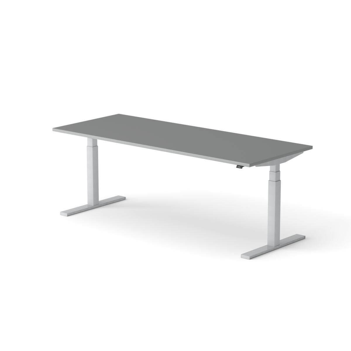 panneau en aggloméré avec revêtement mélaminé, facile d’entretien finition MS Slate. forme de panneau rectangulaire. piètement en T en RAL9006 aluminium blanc. réglage en hauteur via moteur électrique avec transmission manuelle et affichage. fonctions : Mémorisation et rappel automatique des hauteurs de table programmées grâce à la fonction mémoire. avec fiche Euro.