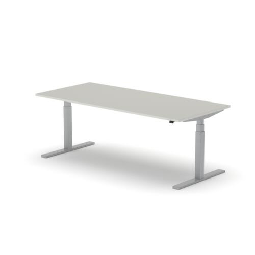 panneau en aggloméré avec revêtement mélaminé, facile d’entretien finition MB White Grey. forme de panneau rectangulaire. piètement en T en RAL9006 aluminium blanc. réglage en hauteur via moteur électrique avec transmission manuelle. avec fiche Euro.