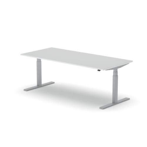 panneau en aggloméré avec revêtement mélaminé, facile d’entretien finition BI White. forme de panneau rectangulaire. piètement en T en RAL9006 aluminium blanc. réglage en hauteur via moteur électrique avec transmission manuelle et affichage. fonctions : Mémorisation et rappel automatique des hauteurs de table programmées grâce à la fonction mémoire. avec fiche Euro.