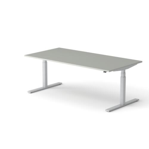 panneau en aggloméré avec revêtement mélaminé, facile d’entretien finition MP Platinum. forme de panneau rectangulaire. piètement en T en RAL9006 aluminium blanc. réglage en hauteur via moteur électrique avec transmission manuelle. avec fiche Euro.
