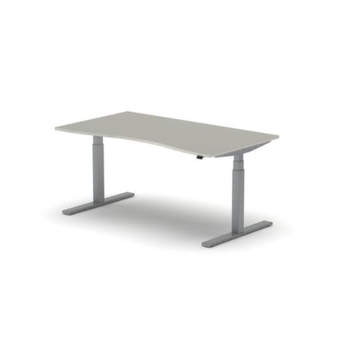 panneau en aggloméré avec revêtement mélaminé, facile d’entretien finition MB White Grey. forme de panneau oscillé. piètement en T en RAL9006 aluminium blanc. réglage en hauteur via moteur électrique avec transmission manuelle. avec fiche Euro.