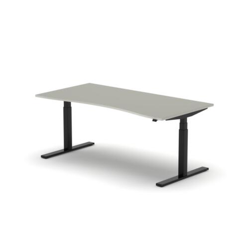 panneau en aggloméré avec revêtement mélaminé, facile d’entretien finition MB White Grey. forme de panneau oscillé. piètement en T en RAL9005 noir foncé. réglage en hauteur via moteur électrique avec transmission manuelle et affichage. fonctions : Mémorisation et rappel automatique des hauteurs de table programmées grâce à la fonction mémoire. avec fiche Euro.