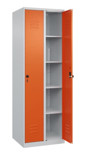 Les principales dimensions de la C+P armoire à linge Classic Plus en un coup d’œil :par compartiment 4 tablettes fixes. porte battante avec porte-étiquette et fentes d’aération. Les gonds intérieurs des portes battantes offrent l’avantage d’un visuel net, car aucune vis ou charnière n’est visible de l’extérieur. Le design de l’armoire n’est donc pas altéré et l’ensemble du meuble semble de meilleure qualité. La surface lisse est également plus facile à nettoyer, car aucun dépôt de saleté ou de poussière n’est à craindre aux endroits inaccessibles. Chaque porte est équipée de série d’un amortisseur, de sorte que, même fermée avec élan, elle ne claque pas. Cela contribue non seulement à améliorer l’environnement sonore, mais protège aussi l’armoire en acier des dommages. La structure BIONIC Steel Frame, inspirée de la nature, est une construction particulièrement efficace et stable. La structure interne raffinée composée de pliages, d’entretoises et d’espaces, ainsi que la plus grande épaisseur de matériau aux endroits cruciaux, comme à l’avant des parois latérales et dans les profilés de cloisons et de caissons, augmentent encore la rigidité. Verrouillable avec Porte-cadenas de sécurité pour cadenas. La serrure de sécurité est particulièrement résistante aux effractions puisqu’elle tourne en position verrouillée et se verrouille uniquement après le retrait de la serrure. Convient pour tous les cadenas avec une épaisseur d'anse de 6 - 8 mm. Les orifices de ventilation supplémentaires dans le compartiment, combinés aux fentes d’aération dans la porte, améliorent le flux d’air. L’intérieur de l’armoire est ainsi mieux ventilé et son contenu sèche plus vite, sans générer de mauvaises odeurs. Pour une apparence fine et un gain de place, l’armoire se pose directement au sol sans socle ni pieds. Des vis de mise à niveau assurent une pose sans vacillement en cas d’éventuelles irrégularités du sol. Le fond de l’armoire est galvanisé pour une protection anticorrosion améliorée. structure en acier, soudé de manière stable. Cela rend la structure particulièrement robuste et résistante, et donc plus durable. Les coins et les angles soudés du corps garantissent une plus grande étanchéité et donc une meilleure protection contre la poussière, l’humidité et la saleté qu’une structure vissée. En outre, il n’est pas nécessaire de procéder à des travaux d’entretien réguliers ni à des réajustements. corps avec thermolaquage en RAL7035 gris clair, face avant avec thermolaquage en RAL2004 orangé pur.