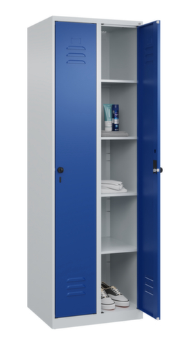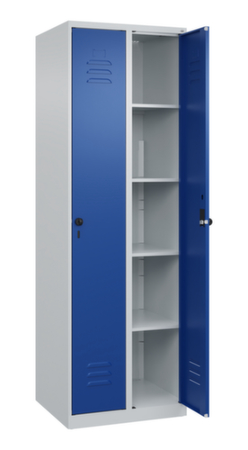 Les principales dimensions de la C+P armoire à linge Classic Plus en un coup d’œil :par compartiment 4 tablettes fixes. porte battante avec porte-étiquette et fentes d’aération. Les gonds intérieurs des portes battantes offrent l’avantage d’un visuel net, car aucune vis ou charnière n’est visible de l’extérieur. Le design de l’armoire n’est donc pas altéré et l’ensemble du meuble semble de meilleure qualité. La surface lisse est également plus facile à nettoyer, car aucun dépôt de saleté ou de poussière n’est à craindre aux endroits inaccessibles. Chaque porte est équipée de série d’un amortisseur, de sorte que, même fermée avec élan, elle ne claque pas. Cela contribue non seulement à améliorer l’environnement sonore, mais protège aussi l’armoire en acier des dommages. La structure BIONIC Steel Frame, inspirée de la nature, est une construction particulièrement efficace et stable. La structure interne raffinée composée de pliages, d’entretoises et d’espaces, ainsi que la plus grande épaisseur de matériau aux endroits cruciaux, comme à l’avant des parois latérales et dans les profilés de cloisons et de caissons, augmentent encore la rigidité. Verrouillable avec Porte-cadenas de sécurité pour cadenas. La serrure de sécurité est particulièrement résistante aux effractions puisqu’elle tourne en position verrouillée et se verrouille uniquement après le retrait de la serrure. Convient pour tous les cadenas avec une épaisseur d'anse de 6 - 8 mm. Les orifices de ventilation supplémentaires dans le compartiment, combinés aux fentes d’aération dans la porte, améliorent le flux d’air. L’intérieur de l’armoire est ainsi mieux ventilé et son contenu sèche plus vite, sans générer de mauvaises odeurs. Pour une apparence fine et un gain de place, l’armoire se pose directement au sol sans socle ni pieds. Des vis de mise à niveau assurent une pose sans vacillement en cas d’éventuelles irrégularités du sol. Le fond de l’armoire est galvanisé pour une protection anticorrosion améliorée. structure en acier, soudé de manière stable. Cela rend la structure particulièrement robuste et résistante, et donc plus durable. Les coins et les angles soudés du corps garantissent une plus grande étanchéité et donc une meilleure protection contre la poussière, l’humidité et la saleté qu’une structure vissée. En outre, il n’est pas nécessaire de procéder à des travaux d’entretien réguliers ni à des réajustements. corps avec thermolaquage en RAL7035 gris clair, face avant avec thermolaquage en RAL5010 bleu gentiane.
