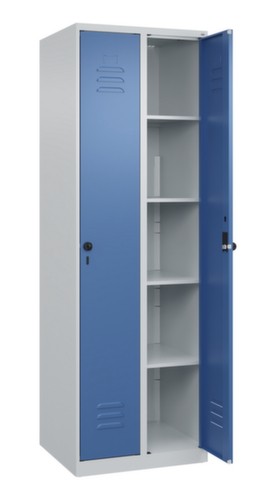 Les principales dimensions de la C+P armoire à linge Classic Plus en un coup d’œil :par compartiment 4 tablettes fixes. porte battante avec porte-étiquette et fentes d’aération. Les gonds intérieurs des portes battantes offrent l’avantage d’un visuel net, car aucune vis ou charnière n’est visible de l’extérieur. Le design de l’armoire n’est donc pas altéré et l’ensemble du meuble semble de meilleure qualité. La surface lisse est également plus facile à nettoyer, car aucun dépôt de saleté ou de poussière n’est à craindre aux endroits inaccessibles. Chaque porte est équipée de série d’un amortisseur, de sorte que, même fermée avec élan, elle ne claque pas. Cela contribue non seulement à améliorer l’environnement sonore, mais protège aussi l’armoire en acier des dommages. La structure BIONIC Steel Frame, inspirée de la nature, est une construction particulièrement efficace et stable. La structure interne raffinée composée de pliages, d’entretoises et d’espaces, ainsi que la plus grande épaisseur de matériau aux endroits cruciaux, comme à l’avant des parois latérales et dans les profilés de cloisons et de caissons, augmentent encore la rigidité. Verrouillable avec Porte-cadenas de sécurité pour cadenas. La serrure de sécurité est particulièrement résistante aux effractions puisqu’elle tourne en position verrouillée et se verrouille uniquement après le retrait de la serrure. Convient pour tous les cadenas avec une épaisseur d'anse de 6 - 8 mm. Les orifices de ventilation supplémentaires dans le compartiment, combinés aux fentes d’aération dans la porte, améliorent le flux d’air. L’intérieur de l’armoire est ainsi mieux ventilé et son contenu sèche plus vite, sans générer de mauvaises odeurs. Pour une apparence fine et un gain de place, l’armoire se pose directement au sol sans socle ni pieds. Des vis de mise à niveau assurent une pose sans vacillement en cas d’éventuelles irrégularités du sol. Le fond de l’armoire est galvanisé pour une protection anticorrosion améliorée. structure en acier, soudé de manière stable. Cela rend la structure particulièrement robuste et résistante, et donc plus durable. Les coins et les angles soudés du corps garantissent une plus grande étanchéité et donc une meilleure protection contre la poussière, l’humidité et la saleté qu’une structure vissée. En outre, il n’est pas nécessaire de procéder à des travaux d’entretien réguliers ni à des réajustements. corps avec thermolaquage en RAL7035 gris clair, face avant avec thermolaquage en RAL5023 bleu distant.