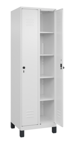Les principales dimensions de la C+P armoire à linge Classic Plus en un coup d’œil :par compartiment 4 tablettes fixes. porte battante avec porte-étiquette et fentes d’aération. Les gonds intérieurs des portes battantes offrent l’avantage d’un visuel net, car aucune vis ou charnière n’est visible de l’extérieur. Le design de l’armoire n’est donc pas altéré et l’ensemble du meuble semble de meilleure qualité. La surface lisse est également plus facile à nettoyer, car aucun dépôt de saleté ou de poussière n’est à craindre aux endroits inaccessibles. Chaque porte est équipée de série d’un amortisseur, de sorte que, même fermée avec élan, elle ne claque pas. Cela contribue non seulement à améliorer l’environnement sonore, mais protège aussi l’armoire en acier des dommages. La structure BIONIC Steel Frame, inspirée de la nature, est une construction particulièrement efficace et stable. La structure interne raffinée composée de pliages, d’entretoises et d’espaces, ainsi que la plus grande épaisseur de matériau aux endroits cruciaux, comme à l’avant des parois latérales et dans les profilés de cloisons et de caissons, augmentent encore la rigidité. Verrouillable avec Porte-cadenas de sécurité pour cadenas. La serrure de sécurité est particulièrement résistante aux effractions puisqu’elle tourne en position verrouillée et se verrouille uniquement après le retrait de la serrure. Convient pour tous les cadenas avec une épaisseur d'anse de 6 - 8 mm. Les orifices de ventilation supplémentaires dans le compartiment, combinés aux fentes d’aération dans la porte, améliorent le flux d’air. L’intérieur de l’armoire est ainsi mieux ventilé et son contenu sèche plus vite, sans générer de mauvaises odeurs. Les pieds encastrés en plastique confèrent non seulement un aspect moderne et léger à l’armoire, qui paraît moins massive, mais offrent également des avantages pratiques. L’espace ouvert au-dessus du sol facilite le nettoyage et le matériau plastique offre une protection accrue contre la corrosion. Cet aspect est particulièrement important dans les environnements où les exigences en matière d’hygiène sont élevées. structure en acier, soudé de manière stable. Cela rend la structure particulièrement robuste et résistante, et donc plus durable. Les coins et les angles soudés du corps garantissent une plus grande étanchéité et donc une meilleure protection contre la poussière, l’humidité et la saleté qu’une structure vissée. En outre, il n’est pas nécessaire de procéder à des travaux d’entretien réguliers ni à des réajustements. corps avec thermolaquage en RAL9016 blanc signalisation, face avant avec thermolaquage en RAL9016 blanc signalisation.
