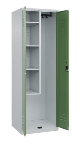 Les principaux détails de la C+P armoire d’entretien Classic Plus en un coup d’œil :La porte à double battant facilite particulièrement l’accès au contenu de l’armoire. Les fentes d’aération assurent une ventilation accrue et protègent ainsi le contenu de l’armoire de l’humidité et de la formation de moisissures, car une bonne circulation de l’air réduit l’humidité. Les gonds intérieurs des portes battantes offrent l’avantage d’un visuel net, car aucune vis ou charnière n’est visible de l’extérieur. Le design de l’armoire n’est donc pas altéré et l’ensemble du meuble semble de meilleure qualité. La surface lisse est également plus facile à nettoyer, car aucun dépôt de saleté ou de poussière n’est à craindre aux endroits inaccessibles. Chaque porte est équipée de série d’un amortisseur, de sorte que, même fermée avec élan, elle ne claque pas. Cela contribue non seulement à améliorer l’environnement sonore, mais protège aussi l’armoire en acier des dommages. 4 niveaux avec tablette. La cloison de séparation médiane raccourcie divise l’armoire en deux parties distinctes qui peuvent être utilisées de différentes manières et pour des objets de différentes tailles, tout en laissant de la place dans la partie inférieure pour les seaux de nettoyage ou autres appareils de nettoyage. Équipé à gauche de 4 casiers avec tablettes fixes, à droite de 1 tringle robuste à profil ovale avec 4 doubles crochets coulissants anti-torsion. verrouillable avec Porte-cadenas de sécurité pour cadenas. La serrure de sécurité est particulièrement résistante aux effractions puisqu’elle tourne en position verrouillée et se verrouille uniquement après le retrait de la serrure. verrouillage commun des portes. Les orifices de ventilation supplémentaires dans le compartiment, combinés aux fentes d’aération dans la porte, améliorent le flux d’air. L’intérieur de l’armoire est ainsi mieux ventilé et son contenu sèche plus vite, sans générer de mauvaises odeurs. Pour une apparence fine et un gain de place, l’armoire se pose directement au sol sans socle ni pieds. Des vis de mise à niveau assurent une pose sans vacillement en cas d’éventuelles irrégularités du sol. Le fond de l’armoire est galvanisé pour une protection anticorrosion améliorée. corps avec thermolaquage en RAL7035 gris clair. face avant avec thermolaquage en RAL6011 vert réséda.
