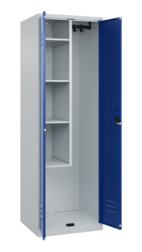Les principaux détails de la C+P armoire d’entretien Classic Plus en un coup d’œil :La porte à double battant facilite particulièrement l’accès au contenu de l’armoire. Les fentes d’aération assurent une ventilation accrue et protègent ainsi le contenu de l’armoire de l’humidité et de la formation de moisissures, car une bonne circulation de l’air réduit l’humidité. Les gonds intérieurs des portes battantes offrent l’avantage d’un visuel net, car aucune vis ou charnière n’est visible de l’extérieur. Le design de l’armoire n’est donc pas altéré et l’ensemble du meuble semble de meilleure qualité. La surface lisse est également plus facile à nettoyer, car aucun dépôt de saleté ou de poussière n’est à craindre aux endroits inaccessibles. Chaque porte est équipée de série d’un amortisseur, de sorte que, même fermée avec élan, elle ne claque pas. Cela contribue non seulement à améliorer l’environnement sonore, mais protège aussi l’armoire en acier des dommages. 4 niveaux avec tablette. La cloison de séparation médiane raccourcie divise l’armoire en deux parties distinctes qui peuvent être utilisées de différentes manières et pour des objets de différentes tailles, tout en laissant de la place dans la partie inférieure pour les seaux de nettoyage ou autres appareils de nettoyage. Équipé à gauche de 4 casiers avec tablettes fixes, à droite de 1 tringle robuste à profil ovale avec 4 doubles crochets coulissants anti-torsion. verrouillable avec serrure à cylindre. verrouillage commun des portes. Les orifices de ventilation supplémentaires dans le compartiment, combinés aux fentes d’aération dans la porte, améliorent le flux d’air. L’intérieur de l’armoire est ainsi mieux ventilé et son contenu sèche plus vite, sans générer de mauvaises odeurs. Pour une apparence fine et un gain de place, l’armoire se pose directement au sol sans socle ni pieds. Des vis de mise à niveau assurent une pose sans vacillement en cas d’éventuelles irrégularités du sol. Le fond de l’armoire est galvanisé pour une protection anticorrosion améliorée. corps avec thermolaquage en RAL7035 gris clair. face avant avec thermolaquage en RAL5010 bleu gentiane.