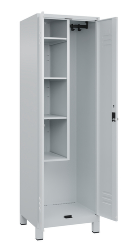 Les principaux détails de la C+P armoire d’entretien Classic Plus en un coup d’œil :La porte à double battant facilite particulièrement l’accès au contenu de l’armoire. Les fentes d’aération assurent une ventilation accrue et protègent ainsi le contenu de l’armoire de l’humidité et de la formation de moisissures, car une bonne circulation de l’air réduit l’humidité. Les gonds intérieurs des portes battantes offrent l’avantage d’un visuel net, car aucune vis ou charnière n’est visible de l’extérieur. Le design de l’armoire n’est donc pas altéré et l’ensemble du meuble semble de meilleure qualité. La surface lisse est également plus facile à nettoyer, car aucun dépôt de saleté ou de poussière n’est à craindre aux endroits inaccessibles. Chaque porte est équipée de série d’un amortisseur, de sorte que, même fermée avec élan, elle ne claque pas. Cela contribue non seulement à améliorer l’environnement sonore, mais protège aussi l’armoire en acier des dommages. 4 niveaux avec tablette. La cloison de séparation médiane raccourcie divise l’armoire en deux parties distinctes qui peuvent être utilisées de différentes manières et pour des objets de différentes tailles, tout en laissant de la place dans la partie inférieure pour les seaux de nettoyage ou autres appareils de nettoyage. Équipé à gauche de 4 casiers avec tablettes fixes, à droite de 1 tringle robuste à profil ovale avec 4 doubles crochets coulissants anti-torsion. verrouillable avec Porte-cadenas de sécurité pour cadenas. La serrure de sécurité est particulièrement résistante aux effractions puisqu’elle tourne en position verrouillée et se verrouille uniquement après le retrait de la serrure. verrouillage commun des portes. Les orifices de ventilation supplémentaires dans le compartiment, combinés aux fentes d’aération dans la porte, améliorent le flux d’air. L’intérieur de l’armoire est ainsi mieux ventilé et son contenu sèche plus vite, sans générer de mauvaises odeurs. Les pieds encastrés en plastique confèrent non seulement un aspect moderne et léger à l’armoire, qui paraît moins massive, mais offrent également des avantages pratiques. L’espace ouvert au-dessus du sol facilite le nettoyage et le matériau plastique offre une protection accrue contre la corrosion. Cet aspect est particulièrement important dans les environnements où les exigences en matière d’hygiène sont élevées. corps avec thermolaquage en RAL7035 gris clair. face avant avec thermolaquage en RAL7035 gris clair.