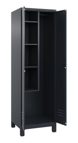 Les principaux détails de la C+P armoire d’entretien Classic Plus en un coup d’œil :La porte à double battant facilite particulièrement l’accès au contenu de l’armoire. Les fentes d’aération assurent une ventilation accrue et protègent ainsi le contenu de l’armoire de l’humidité et de la formation de moisissures, car une bonne circulation de l’air réduit l’humidité. Les gonds intérieurs des portes battantes offrent l’avantage d’un visuel net, car aucune vis ou charnière n’est visible de l’extérieur. Le design de l’armoire n’est donc pas altéré et l’ensemble du meuble semble de meilleure qualité. La surface lisse est également plus facile à nettoyer, car aucun dépôt de saleté ou de poussière n’est à craindre aux endroits inaccessibles. Chaque porte est équipée de série d’un amortisseur, de sorte que, même fermée avec élan, elle ne claque pas. Cela contribue non seulement à améliorer l’environnement sonore, mais protège aussi l’armoire en acier des dommages. 4 niveaux avec tablette. La cloison de séparation médiane raccourcie divise l’armoire en deux parties distinctes qui peuvent être utilisées de différentes manières et pour des objets de différentes tailles, tout en laissant de la place dans la partie inférieure pour les seaux de nettoyage ou autres appareils de nettoyage. Équipé à gauche de 4 casiers avec tablettes fixes, à droite de 1 tringle robuste à profil ovale avec 4 doubles crochets coulissants anti-torsion. verrouillable avec Porte-cadenas de sécurité pour cadenas. La serrure de sécurité est particulièrement résistante aux effractions puisqu’elle tourne en position verrouillée et se verrouille uniquement après le retrait de la serrure. verrouillage commun des portes. Les orifices de ventilation supplémentaires dans le compartiment, combinés aux fentes d’aération dans la porte, améliorent le flux d’air. L’intérieur de l’armoire est ainsi mieux ventilé et son contenu sèche plus vite, sans générer de mauvaises odeurs. Les pieds encastrés en plastique confèrent non seulement un aspect moderne et léger à l’armoire, qui paraît moins massive, mais offrent également des avantages pratiques. L’espace ouvert au-dessus du sol facilite le nettoyage et le matériau plastique offre une protection accrue contre la corrosion. Cet aspect est particulièrement important dans les environnements où les exigences en matière d’hygiène sont élevées. corps avec thermolaquage en RAL7016 gris anthracite. face avant avec thermolaquage en RAL7016 gris anthracite.