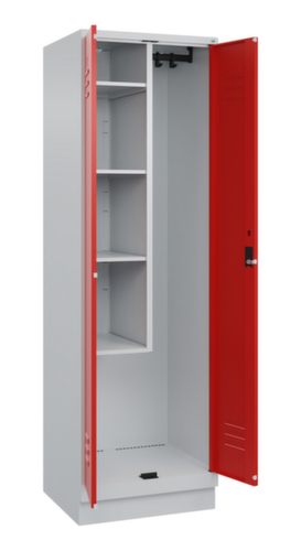 Les principaux détails de la C+P armoire d’entretien Classic Plus en un coup d’œil :La porte à double battant facilite particulièrement l’accès au contenu de l’armoire. Les fentes d’aération assurent une ventilation accrue et protègent ainsi le contenu de l’armoire de l’humidité et de la formation de moisissures, car une bonne circulation de l’air réduit l’humidité. Les gonds intérieurs des portes battantes offrent l’avantage d’un visuel net, car aucune vis ou charnière n’est visible de l’extérieur. Le design de l’armoire n’est donc pas altéré et l’ensemble du meuble semble de meilleure qualité. La surface lisse est également plus facile à nettoyer, car aucun dépôt de saleté ou de poussière n’est à craindre aux endroits inaccessibles. Chaque porte est équipée de série d’un amortisseur, de sorte que, même fermée avec élan, elle ne claque pas. Cela contribue non seulement à améliorer l’environnement sonore, mais protège aussi l’armoire en acier des dommages. 4 niveaux avec tablette. La cloison de séparation médiane raccourcie divise l’armoire en deux parties distinctes qui peuvent être utilisées de différentes manières et pour des objets de différentes tailles, tout en laissant de la place dans la partie inférieure pour les seaux de nettoyage ou autres appareils de nettoyage. Équipé à gauche de 4 casiers avec tablettes fixes, à droite de 1 tringle robuste à profil ovale avec 4 doubles crochets coulissants anti-torsion. verrouillable avec serrure à cylindre. verrouillage commun des portes. Les orifices de ventilation supplémentaires dans le compartiment, combinés aux fentes d’aération dans la porte, améliorent le flux d’air. L’intérieur de l’armoire est ainsi mieux ventilé et son contenu sèche plus vite, sans générer de mauvaises odeurs. Le socle encastré permet de répartir uniformément le poids de l’armoire sur le sol. Cela augmente la stabilité et l’armoire peut supporter des charges plus lourdes qu’une armoire à pieds. De plus, la saleté, la poussière et l’humidité ne peuvent pas s’infiltrer sous l’armoire, ce qui réduit la surface de nettoyage. corps avec thermolaquage en RAL7035 gris clair. face avant avec thermolaquage en RAL3020 rouge signalisation.