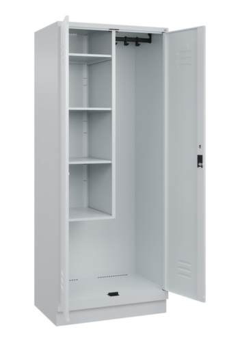 Les principaux détails de la C+P armoire d’entretien Classic Plus en un coup d’œil :La porte à double battant facilite particulièrement l’accès au contenu de l’armoire. Les fentes d’aération assurent une ventilation accrue et protègent ainsi le contenu de l’armoire de l’humidité et de la formation de moisissures, car une bonne circulation de l’air réduit l’humidité. Les gonds intérieurs des portes battantes offrent l’avantage d’un visuel net, car aucune vis ou charnière n’est visible de l’extérieur. Le design de l’armoire n’est donc pas altéré et l’ensemble du meuble semble de meilleure qualité. La surface lisse est également plus facile à nettoyer, car aucun dépôt de saleté ou de poussière n’est à craindre aux endroits inaccessibles. Chaque porte est équipée de série d’un amortisseur, de sorte que, même fermée avec élan, elle ne claque pas. Cela contribue non seulement à améliorer l’environnement sonore, mais protège aussi l’armoire en acier des dommages. 4 niveaux avec tablette. La cloison de séparation médiane raccourcie divise l’armoire en deux parties distinctes qui peuvent être utilisées de différentes manières et pour des objets de différentes tailles, tout en laissant de la place dans la partie inférieure pour les seaux de nettoyage ou autres appareils de nettoyage. Équipé à gauche de 4 casiers avec tablettes fixes, à droite de 1 tringle robuste à profil ovale avec 4 doubles crochets coulissants anti-torsion. verrouillable avec serrure à cylindre. verrouillage commun des portes. Les orifices de ventilation supplémentaires dans le compartiment, combinés aux fentes d’aération dans la porte, améliorent le flux d’air. L’intérieur de l’armoire est ainsi mieux ventilé et son contenu sèche plus vite, sans générer de mauvaises odeurs. Le socle encastré permet de répartir uniformément le poids de l’armoire sur le sol. Cela augmente la stabilité et l’armoire peut supporter des charges plus lourdes qu’une armoire à pieds. De plus, la saleté, la poussière et l’humidité ne peuvent pas s’infiltrer sous l’armoire, ce qui réduit la surface de nettoyage. corps avec thermolaquage en RAL7035 gris clair. face avant avec thermolaquage en RAL7035 gris clair.